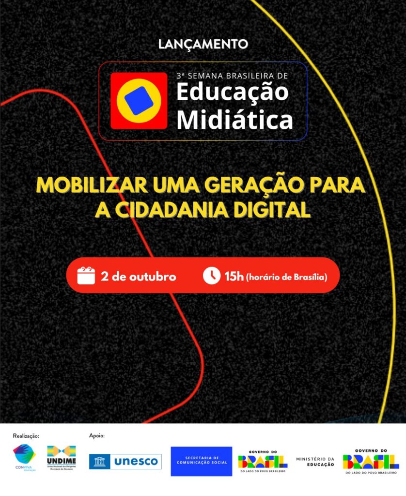 Nesta quinta-feira, 2 de outubro, às 15h (horário de Brasília), será apresentada em videoconferência a 3ª Semana Brasileira de Educação Midiática, um evento realizado pelo Governo Federal em parceria com a Undime, o Consed e a Unesco que celebra e compartilha as diversas iniciativas e boas práticas de educação midiática no Brasil. O tema este ano é: “Mobilizar uma geração para a cidadania digital”.