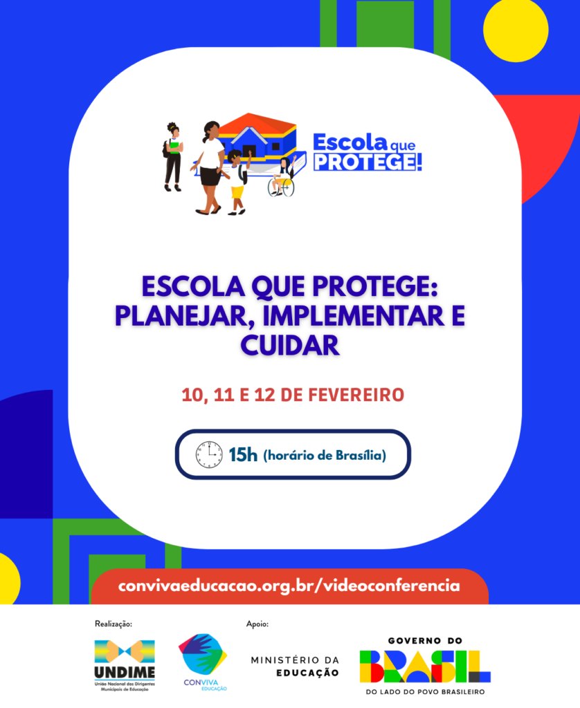 A Undime, em parceria com o Ministério da Educação (MEC), realizará a série de webinários “Escola que Protege: planejar, implementar e cuidar”. Serão três dias – 10, 11 e 12 de fevereiro – com transmissões ao vivo, às 15h (horário de Brasília), pelos canais do Conviva Educação e do MEC no YouTube.