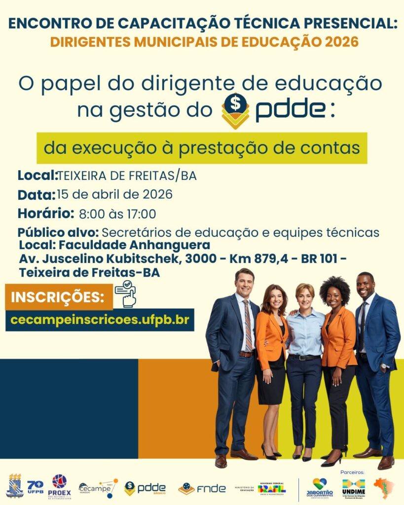 Dirigentes municipais de educação e equipes técnicas das Secretarias Municipais de Educação têm um importante compromisso nesta terça-feira, 15 de abril de 2026, em Teixeira de Freitas, no extremo sul da Bahia. O município sediará o Encontro de Capacitação Técnica Presencial 2026, com foco no fortalecimento da gestão do Programa Dinheiro Direto na Escola (PDDE).